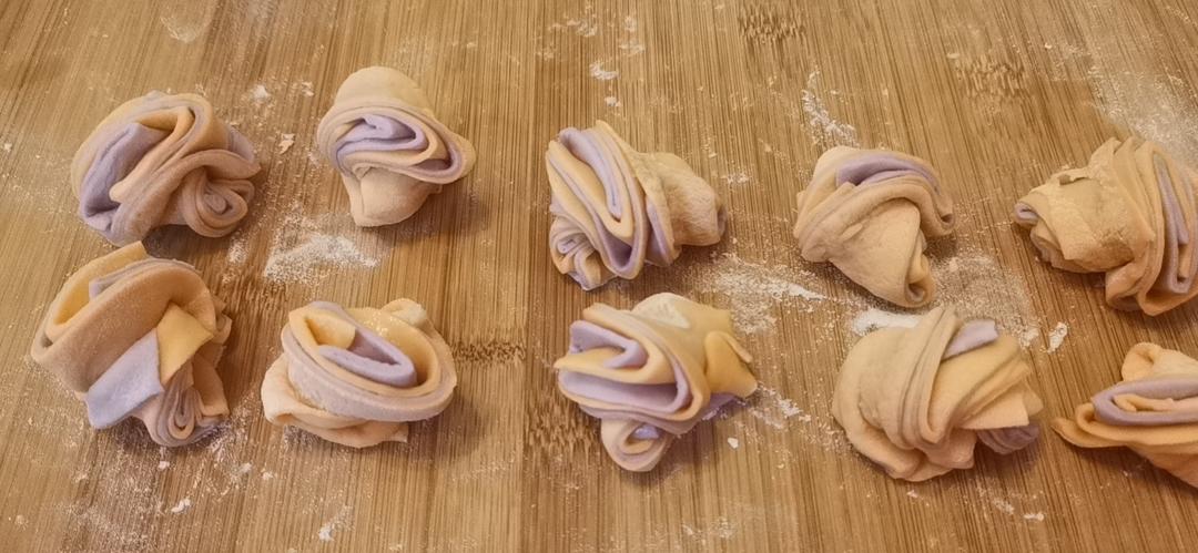 宝宝辅食花卷,用胡萝卜汁加紫甘蓝汁做花卷,捏好形状后放入北鼎蒸炖锅中蒸15分钟即可