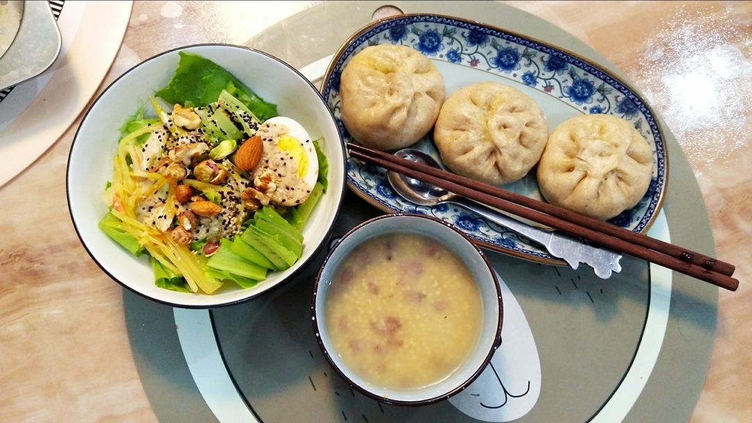 黑麦酱肉包,拌油麦(麻酱汁,海鲜酱油,黑芝麻,坚果,半个...