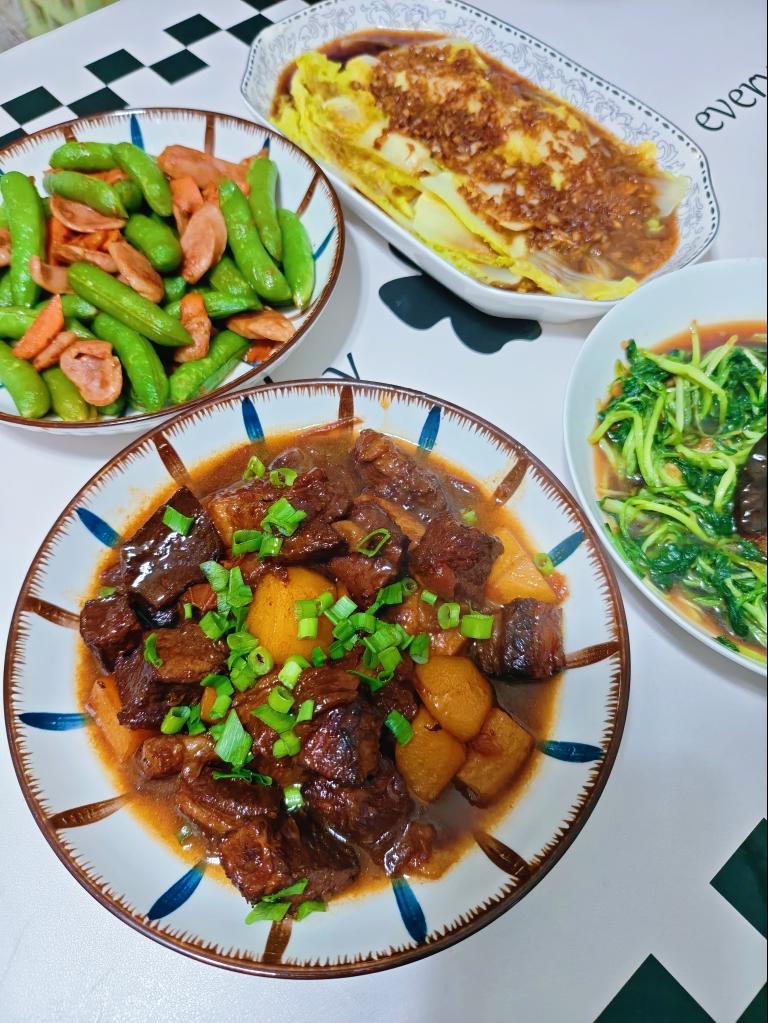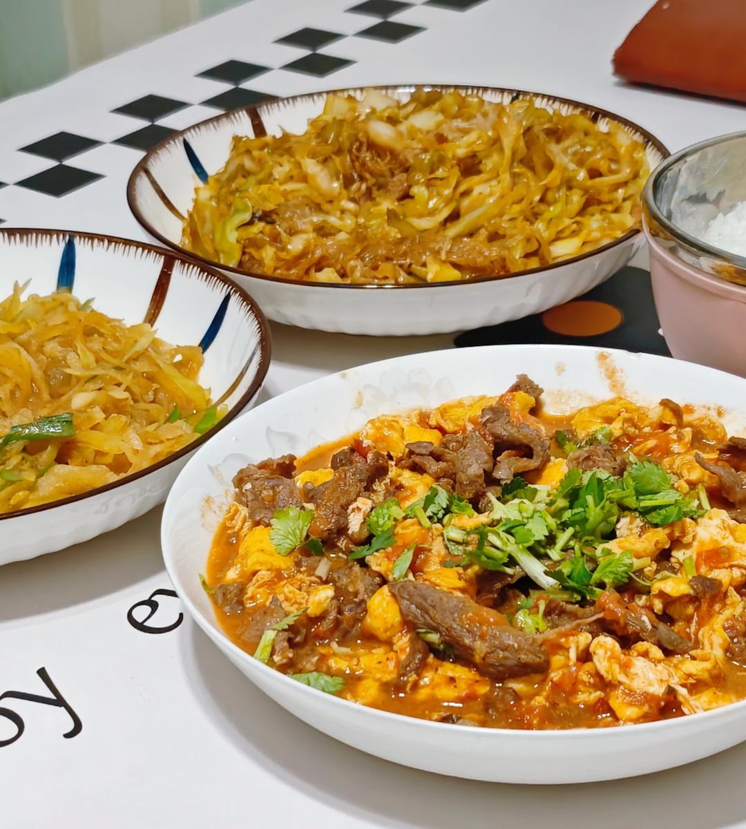 番茄鸡蛋炒牛肉,醋溜土豆丝,粉丝儿肉丝儿洋白菜~天冷整点下饭菜