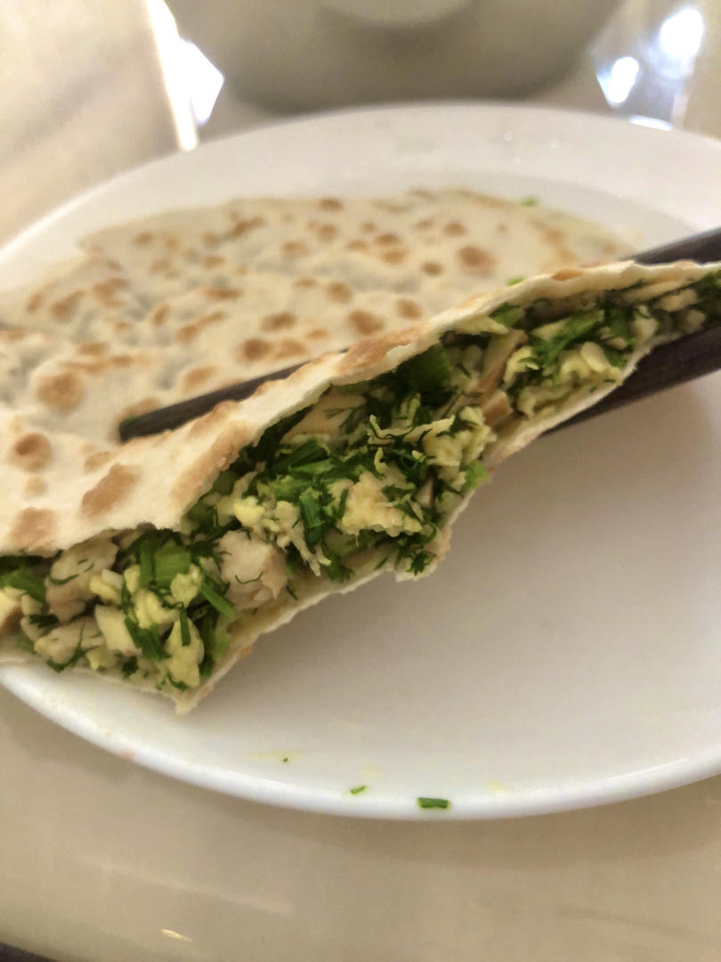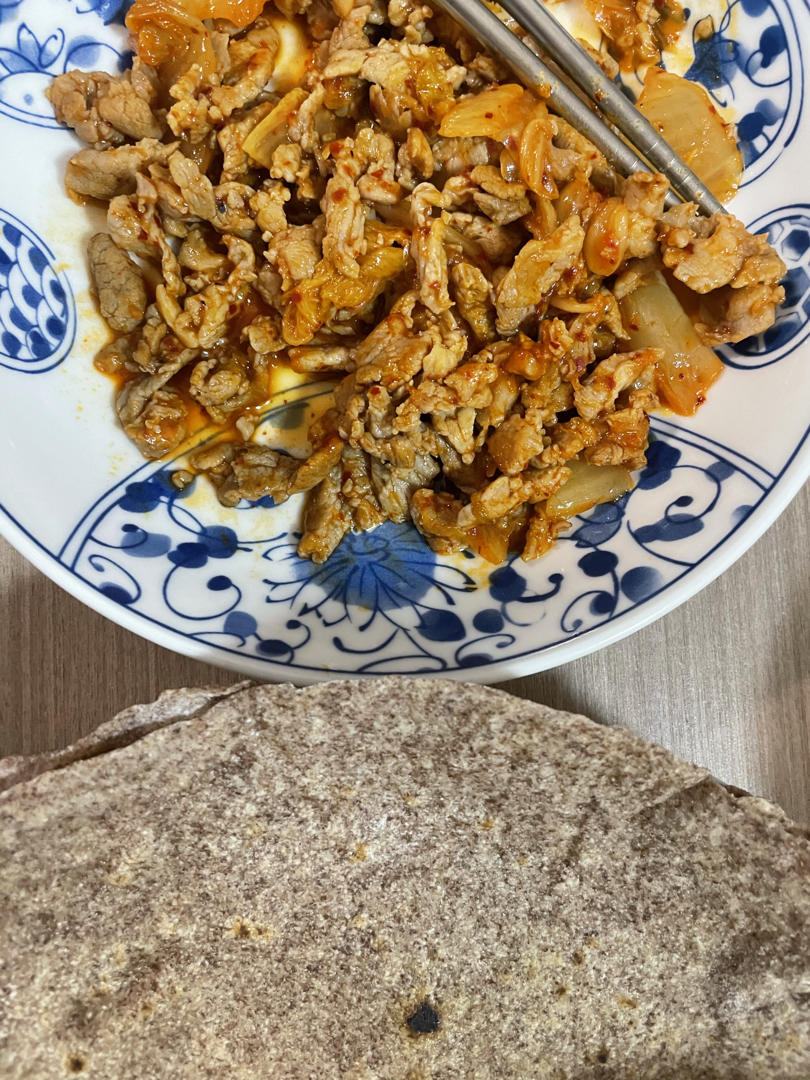 配了泡菜炒肉,卷起来挺好吃!