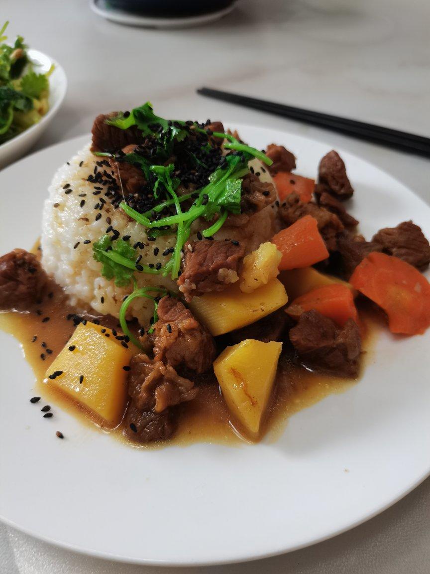 小韩的早餐,牛肉土豆盖浇饭。