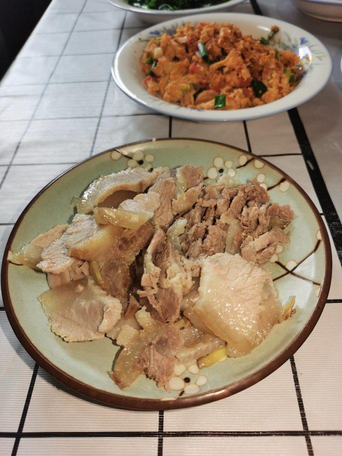 午餐•2021年5月23日白切肉,萝卜干,番茄炒蛋干了,木耳菜,继续虾,昨晚吃剩的猪肝,...