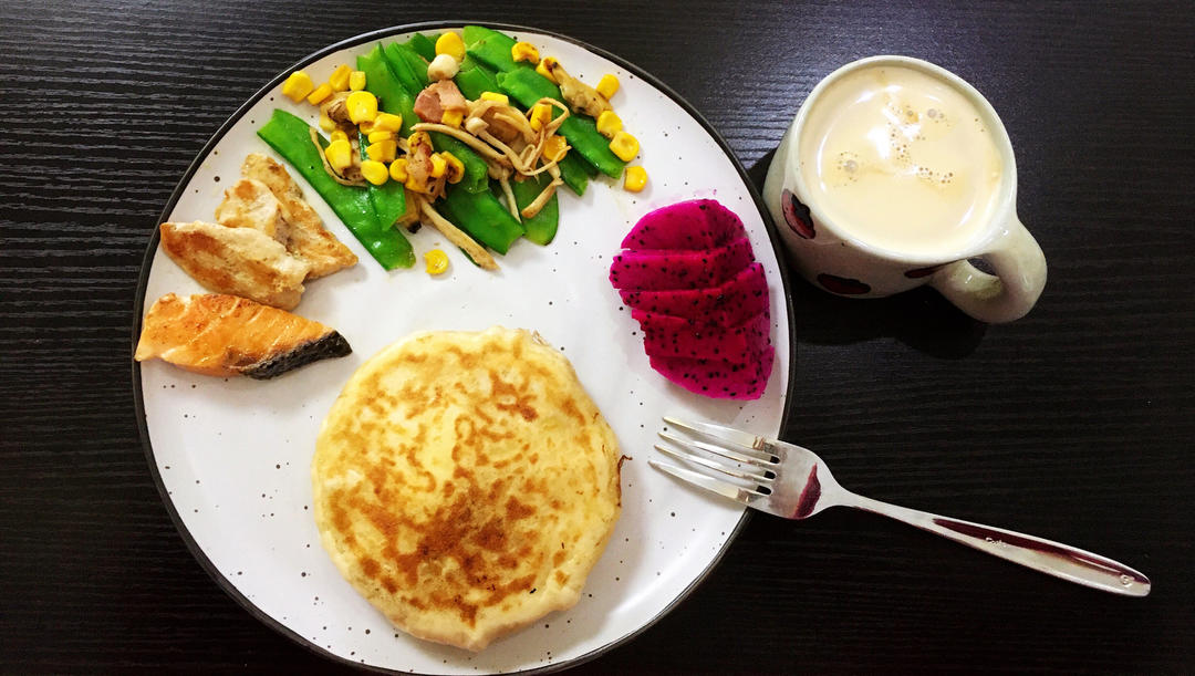 奶酪饼,煎鸡胸,煎三文鱼,炒杂蔬,水果,无糖拿铁。