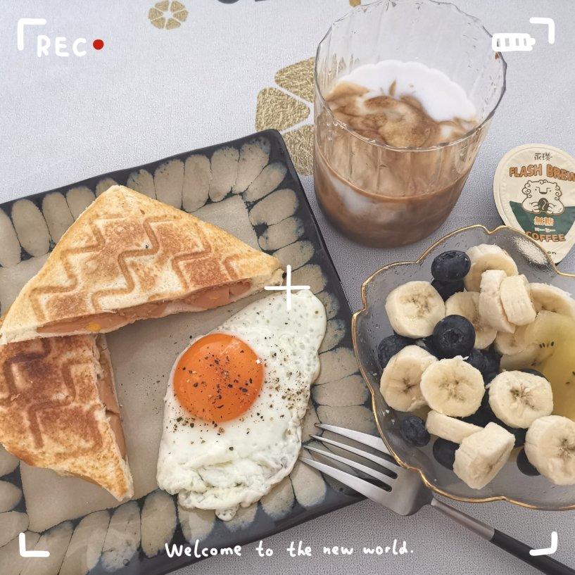 玉米肠花生酱三明治,煎鸡蛋,蓝莓香蕉,生椰拿铁