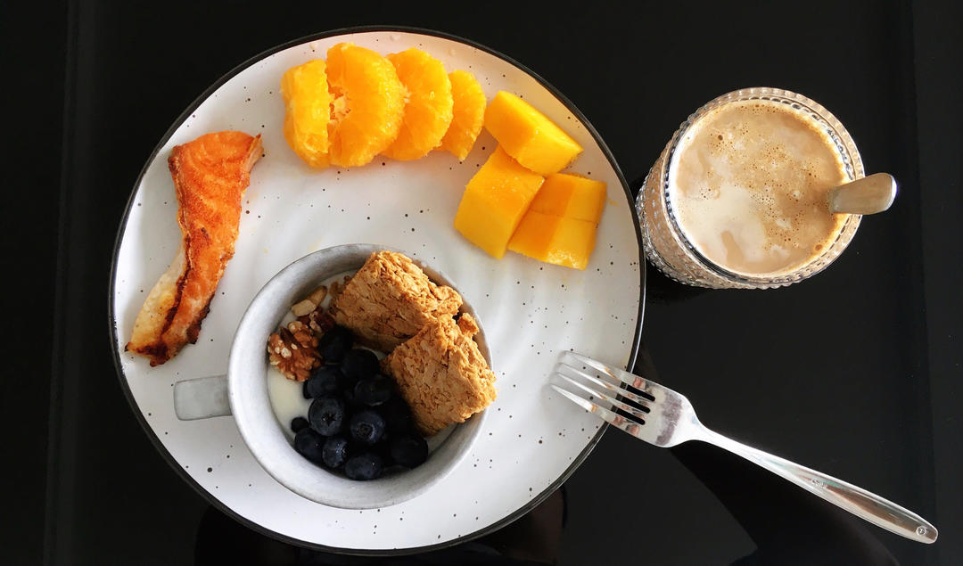 酸奶+全麦棒+无盐坚果+蓝莓,水果,煎三文鱼,无糖拿铁。