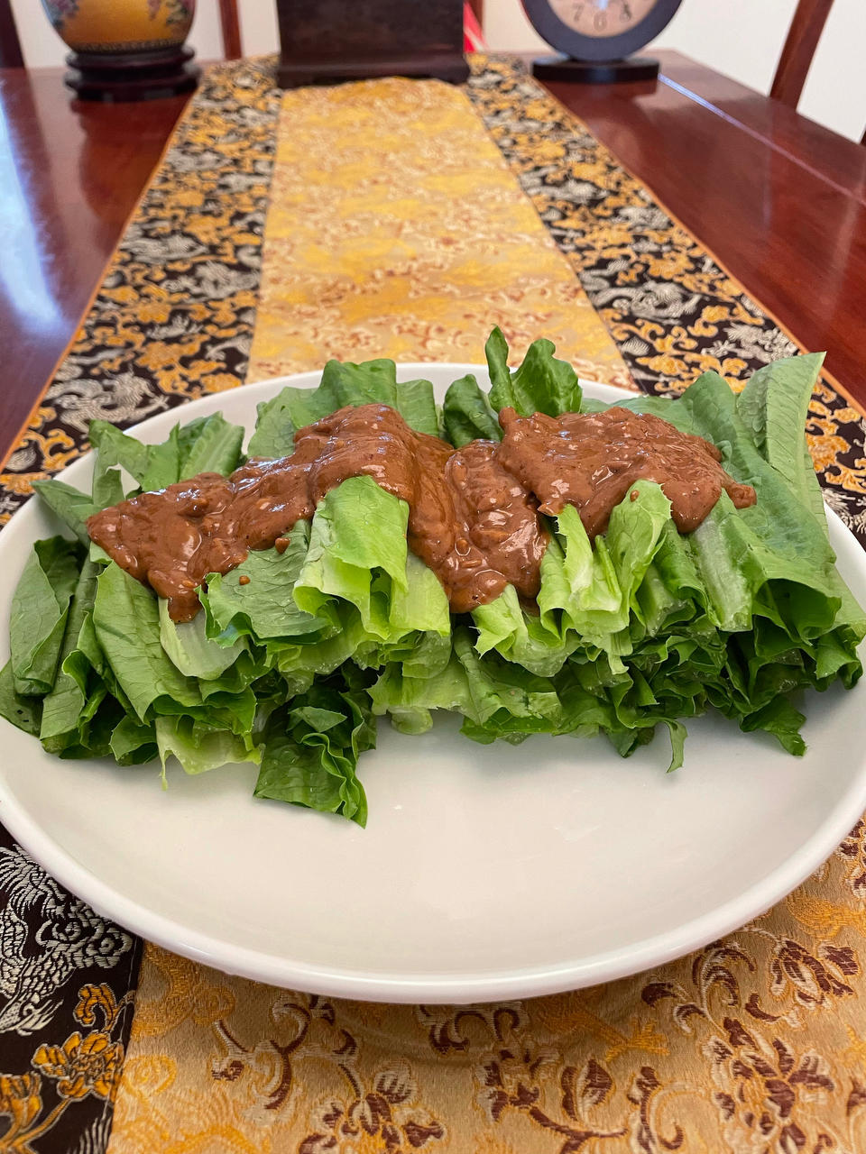 川麻油麦菜:味浓郁,带点辣。略咸,下饭可以。下次用一半料汁。不放红油酱,会更好吃😋😋😋……