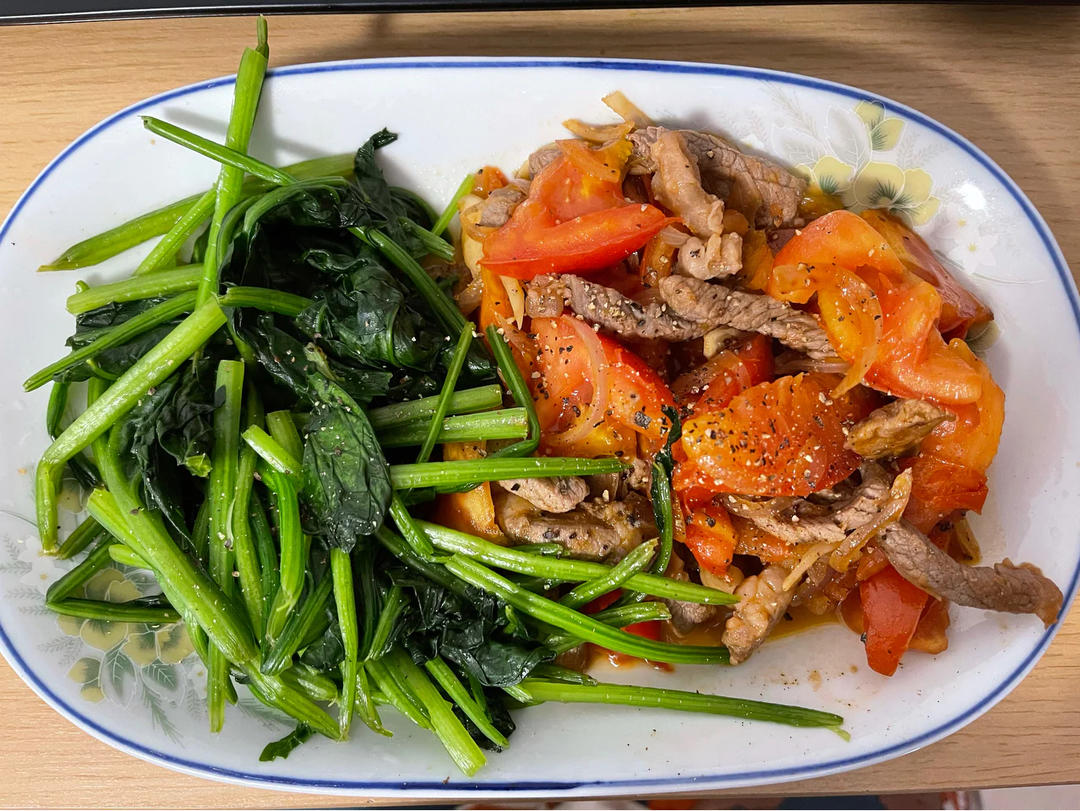 青瓜炒牛肉+三色蒸蛋+菜心