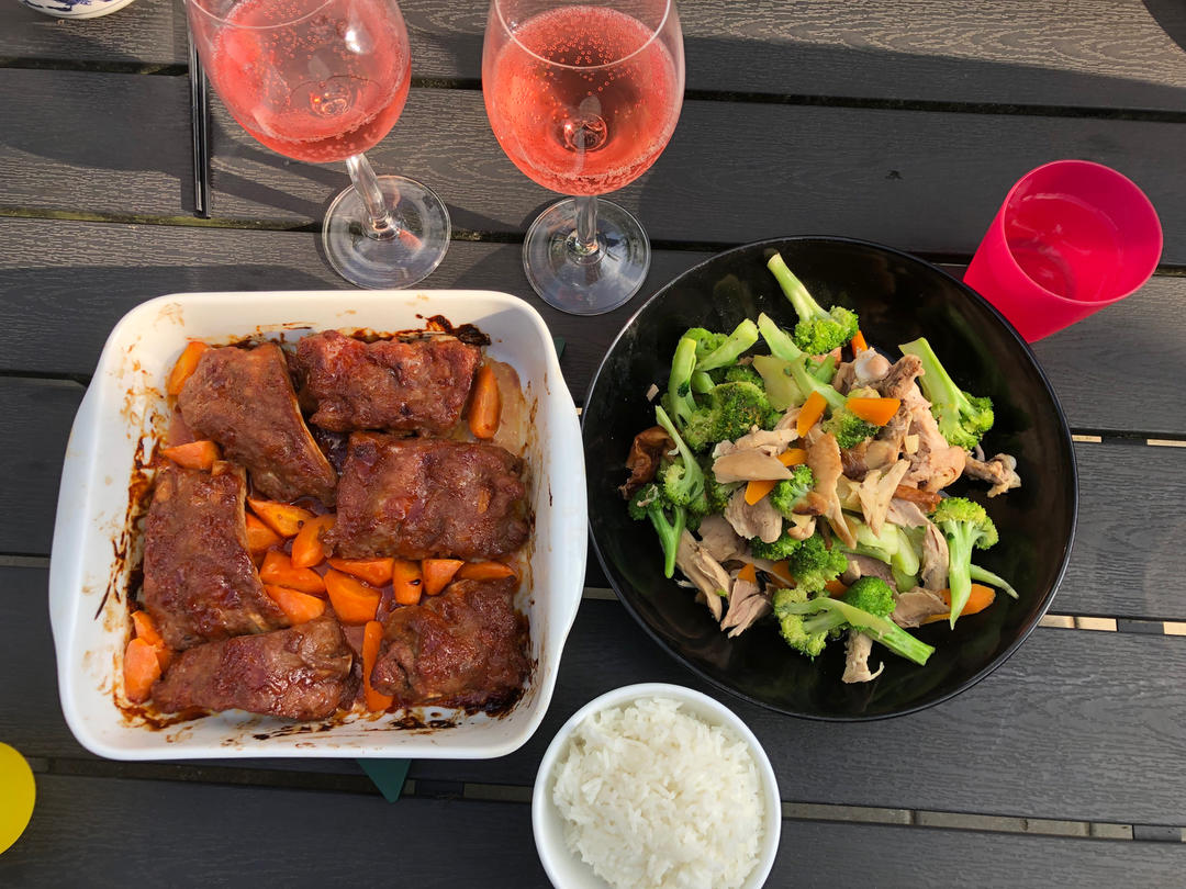 今天又出去玩了一整天,回家晩了,烤了一份半成品的barbecue 排骨,用昨天吃剩的鸡腿肉炒了一份西兰花,开一瓶意大利的...