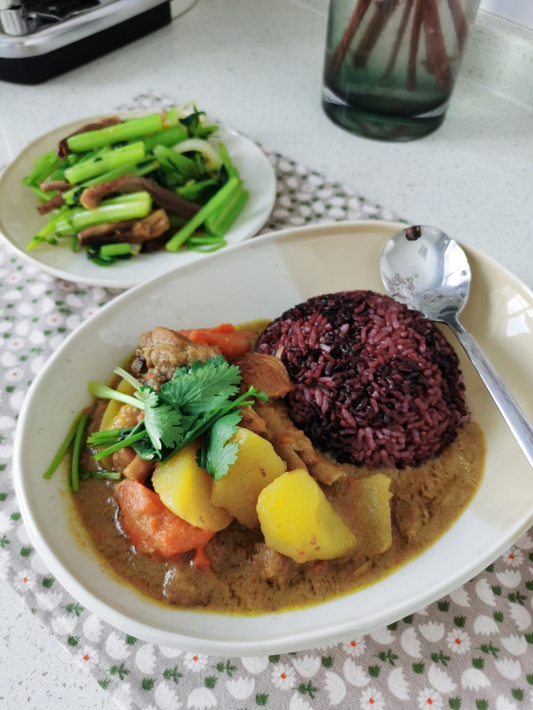 用的绿咖喱,没有加糖。先炖熟鸡肉,胡萝卜土豆咖喱酱椰浆一起放。