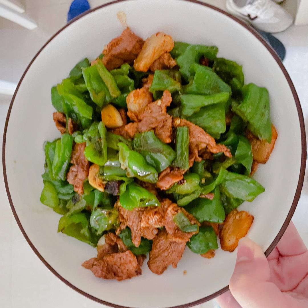 步骤一:4个青椒洗干净 切块;准备一块肉洗干净 切姜片 蒜拍碎