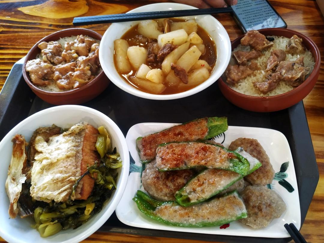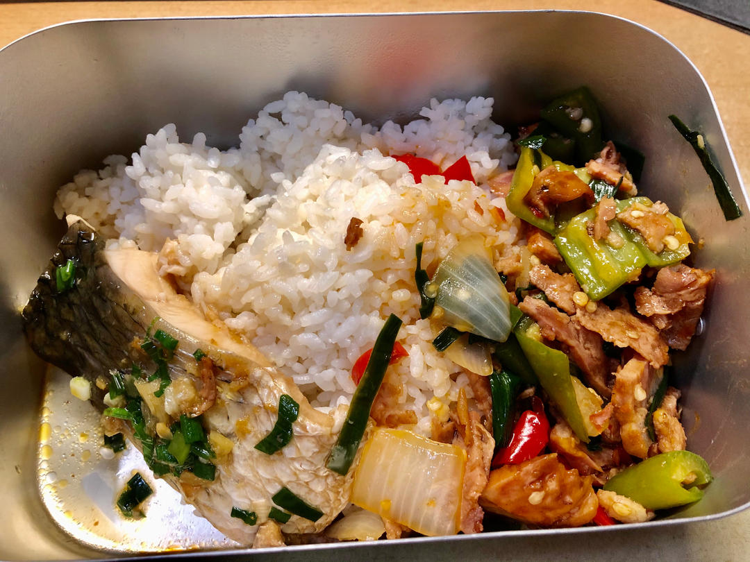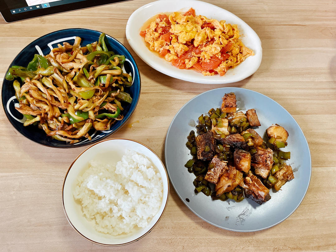 青椒榨菜肉丝,番茄炒鸡蛋,煎腊鱼,米饭