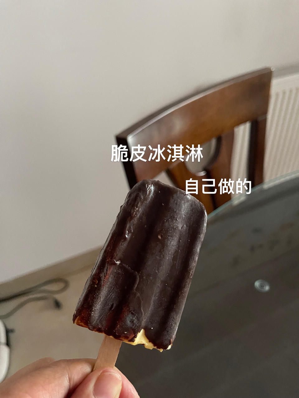 我有点迷恋自己做的脆皮巧克力,以自己午餐好像没有吃饱为由,心安理得的从冰箱中取出一支吃吃(不会长肉),哇,爽,一支冷饮吃...