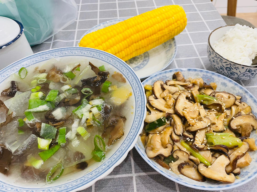 快手午餐|香菇上海青苗+蒜蓉海带苗+鸡丝甘蓝红萝卜沙拉+米饭+薏米茯苓茶~🌷