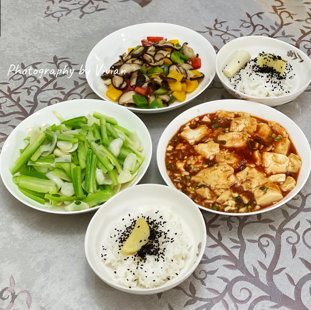 周末午晚餐|花菇彩椒+西芹百合+素烧豆腐+米饭~🌷