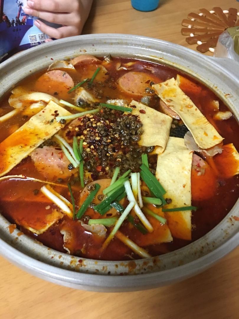 青花椒黑鱼片,加了豆皮,火腿肠和秀珍菇,味道一级棒!