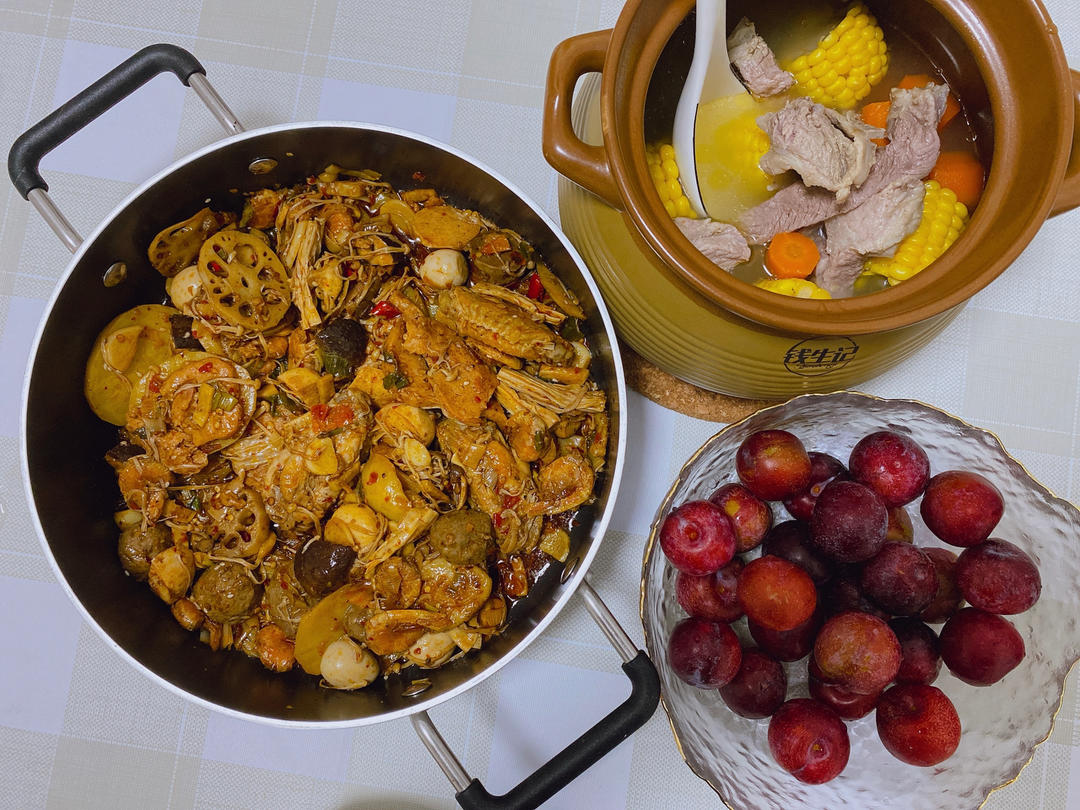 是的小鸟胃中午没吃完那个香锅,又煲了个汤,凑上一碗水果当晚饭了