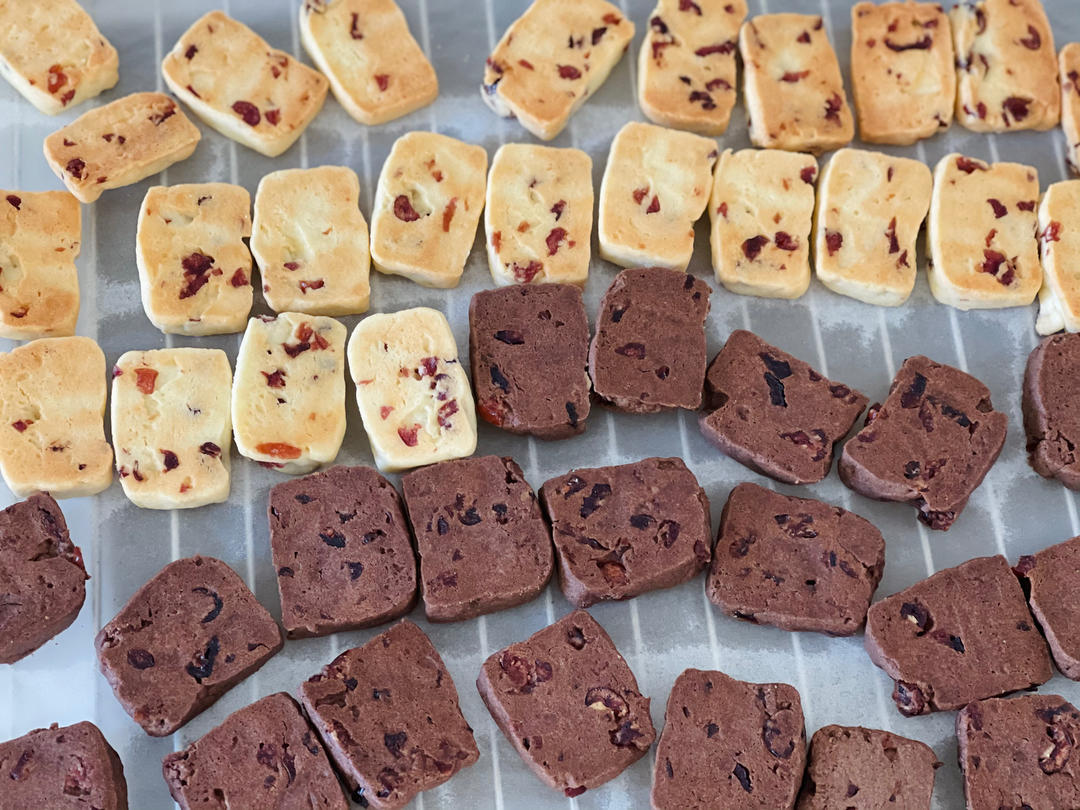 低粉230克,黄油125克,绵白糖60克,蔓越莓干65克,全蛋液48克,可可粉8克,盐2克,160度25分钟