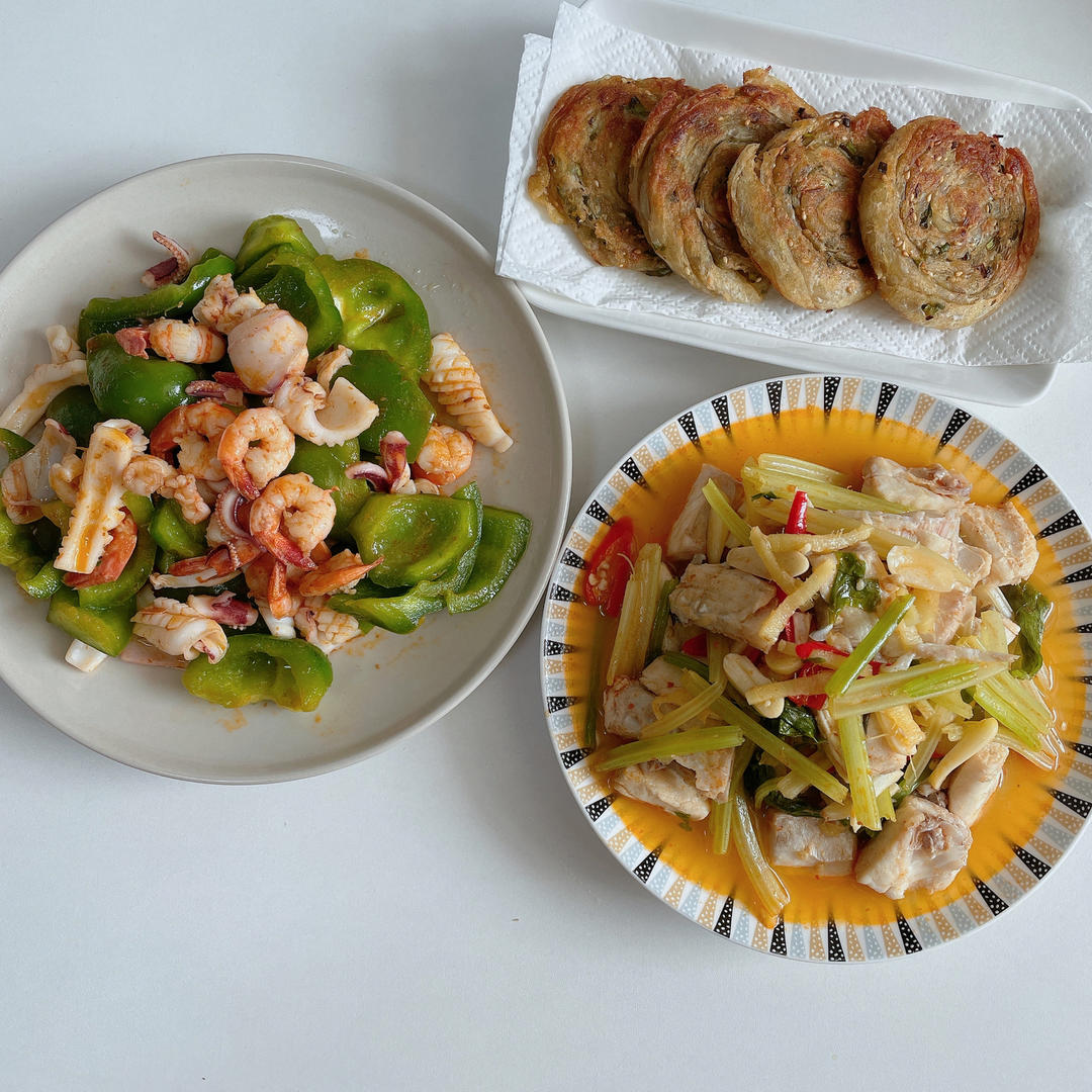 辣炒剥皮鱼 青椒鱿鱼炒虾仁 葱油饼