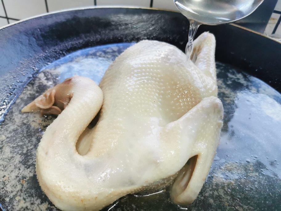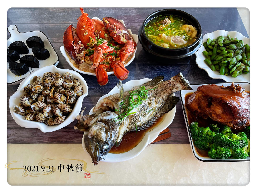 中秋节午餐,白切鸡,茄汁大虾,豆酱焖扒皮鱼,鸡汤浸香菇木耳腐竹,上汤白菜