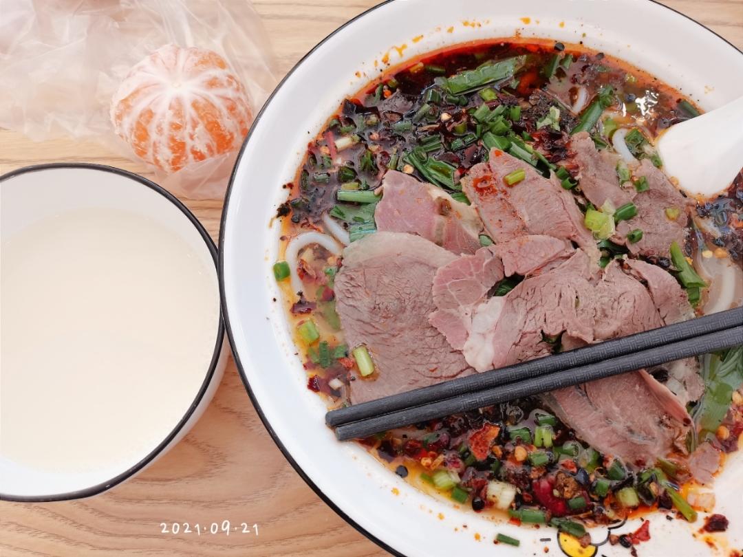 羊肉粉+无糖豆浆+桔子一个,先喝豆浆吃半个桔子,羊肉粉剩了一半,吃了里面的配菜,韭菜香菜,不排斥。