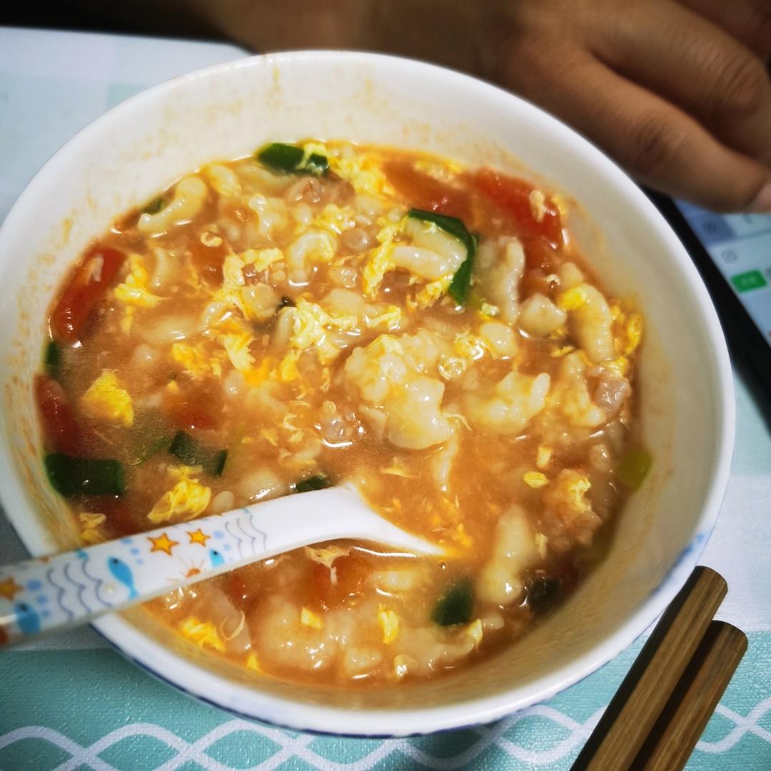 加了虾仁的疙瘩汤,拌疙瘩把握不好