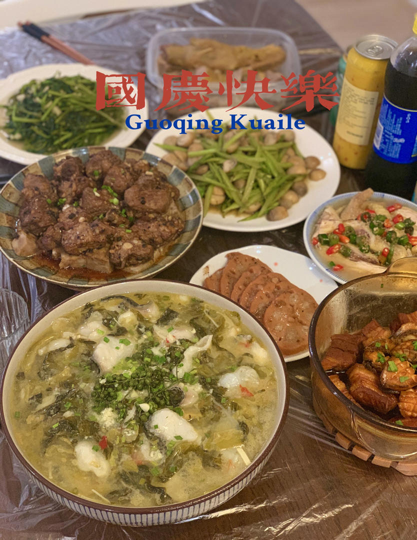 豬肉釀豆卜,蒸鯇魚腩,栗子燜雞,奧爾良雞翅,蒸藍蟹,蝦仁韭菜煎蛋,醋溜土豆絲,鹽水西蘭花,泡菜 #晚餐•2021年10月...