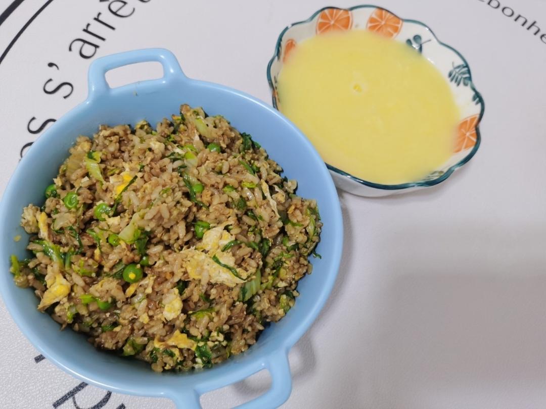 酱油蛋炒饭(青豆 +奶🥬)+玉米🌽粥