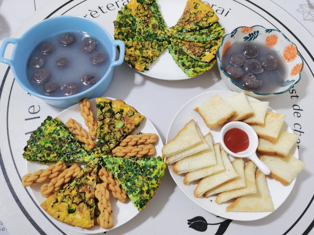 今日份韭菜鸡蛋饼🫓+秋葵鸡蛋饼+黑糯米汤圆+烤面包片+小麻花🌸