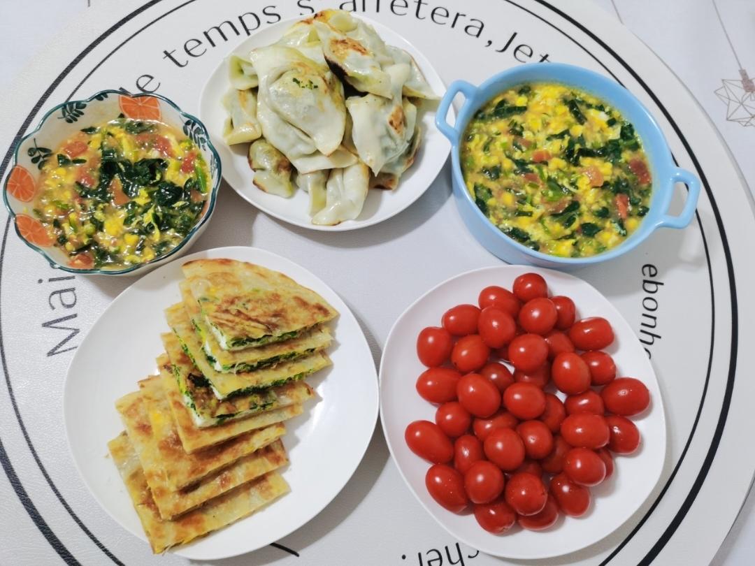 菠菜西红柿鸡蛋玉米🌽面疙瘩汤+香煎水饺🥟+菠菜鸡蛋灌饼🫓+圣女果🍅