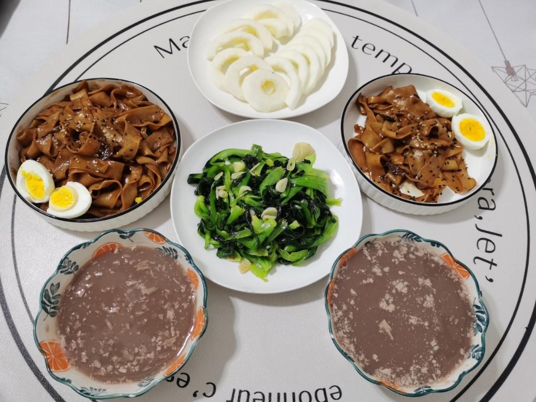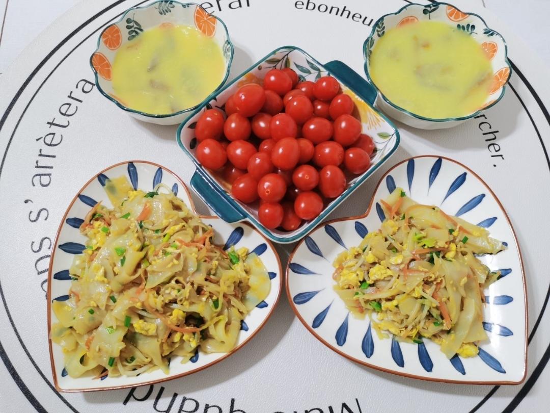 今日份麻酱炒凉皮(豆芽卷心菜胡萝卜🥕鸡蛋🥚)+地瓜🍠干玉米🌽糊+圣女果