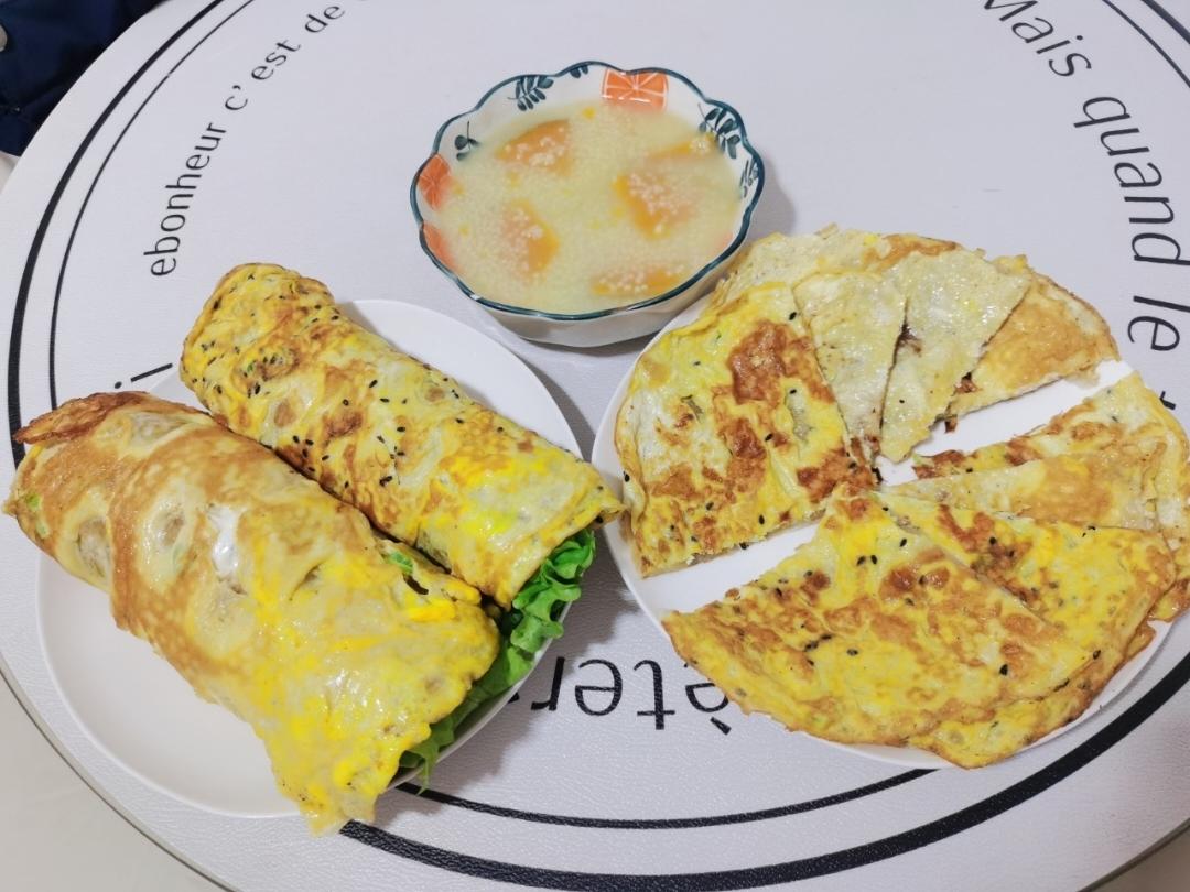 上周早餐~手抓饼版的煎饼果子+地瓜🍠小米粥