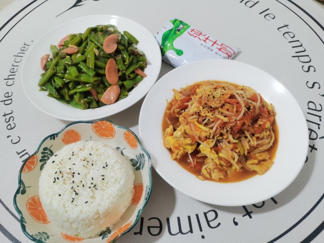 上周某天的早餐~西红柿🍅豆芽炒鸡蛋+焖芸豆+米饭🍚+牛奶🥛