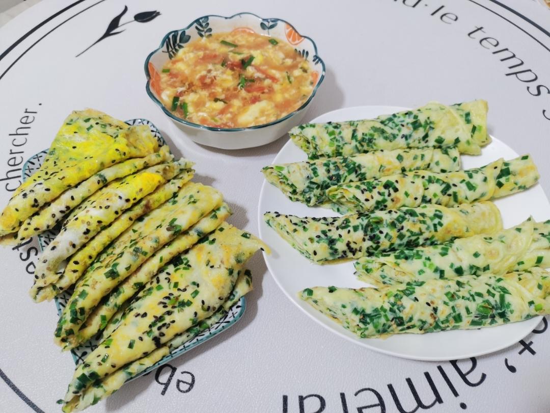 韭菜鸡蛋薄饼+西红柿🍅鸡蛋汤