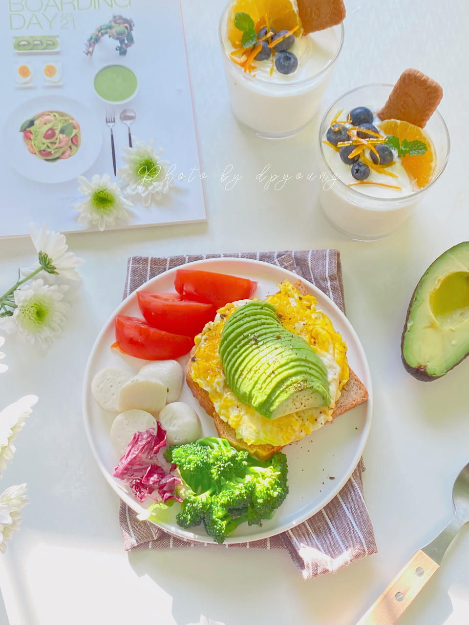 意式炒蛋牛油果三明治,酸奶杯。