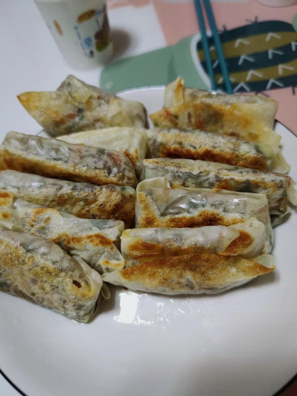 烤鸭剩下的春卷皮,随便泡一点粉丝,青菜,卷一卷,煎着吃