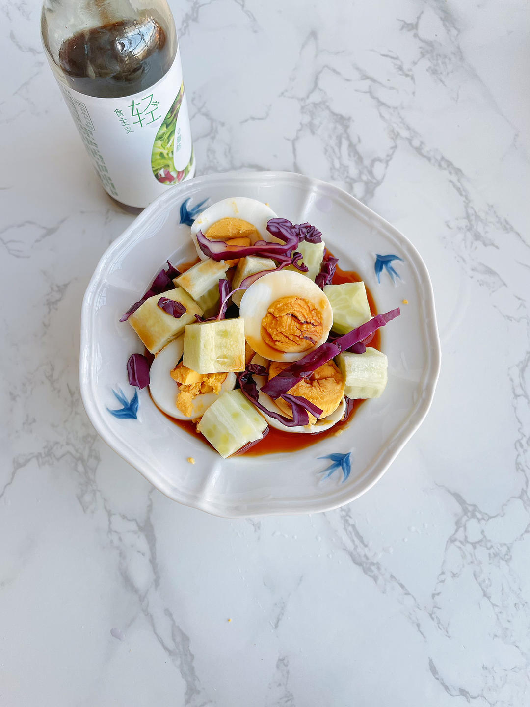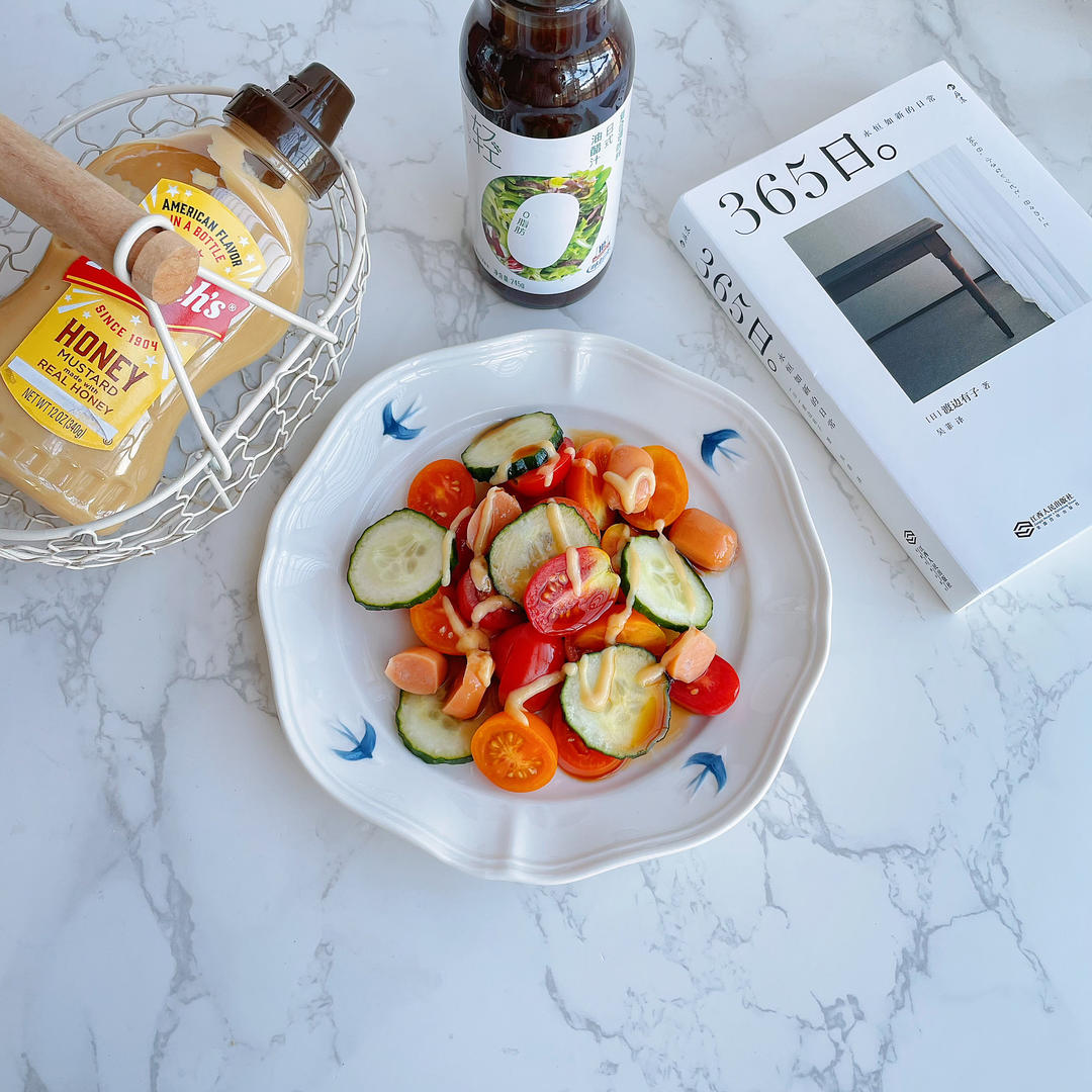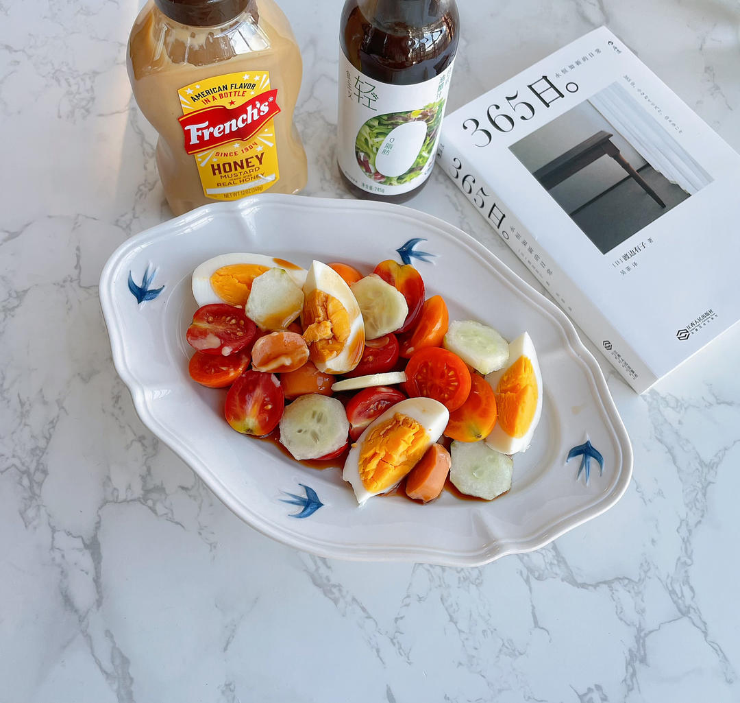 黄瓜,圣女果,水煮蛋,肉肠,味好美沙拉汁