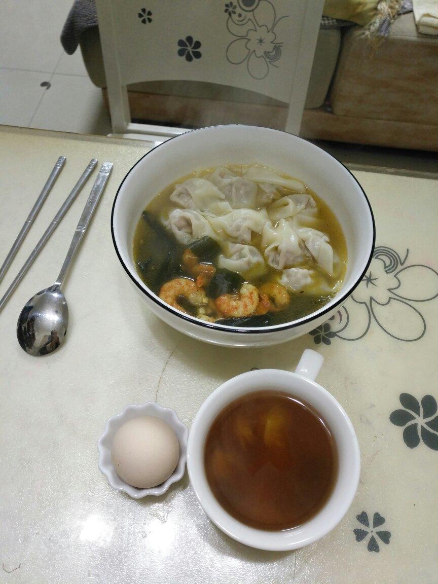 周五早餐,海味抄手,鸡蛋,果茶
