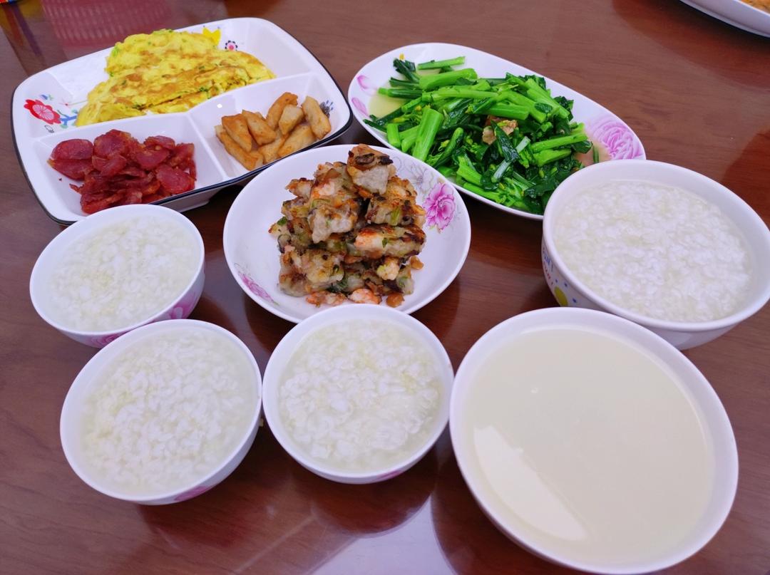 晚餐白粥小菜,还有蒸虾糕,草莓是下午用来做草莓酱的