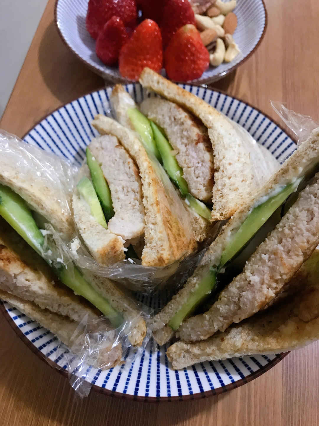 马蹄肉饼做成三明治,加入低脂蛋黄酱、水煮蛋和黄瓜长片,还蛮好吃的,清淡口味