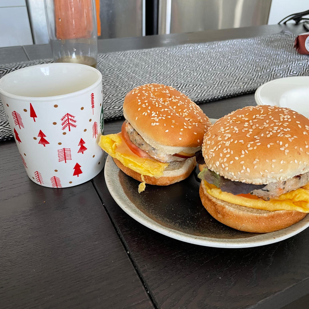 周日早餐吃虾饼汉堡🍔,挤在一个盘子里吃热闹