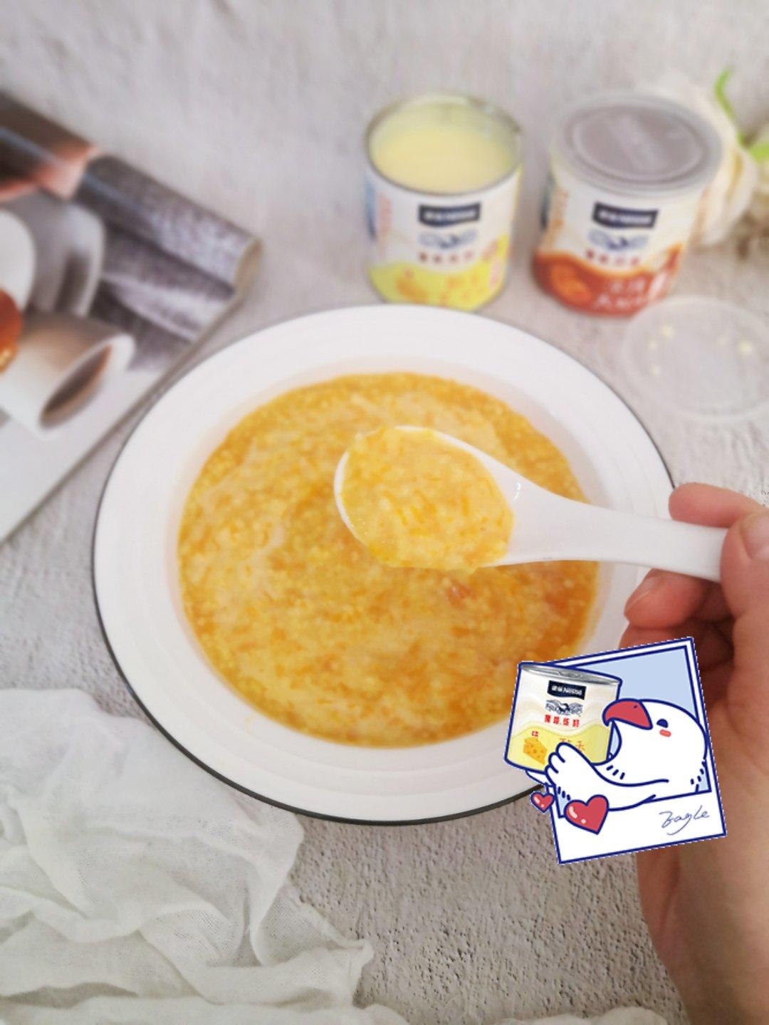 晚餐一人食,煮一大碗南瓜小米粥,加一大勺雀巢炼...