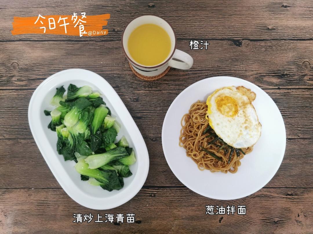 葱油拌面 + 荷包蛋 + 清炒上海青苗 + 橙汁