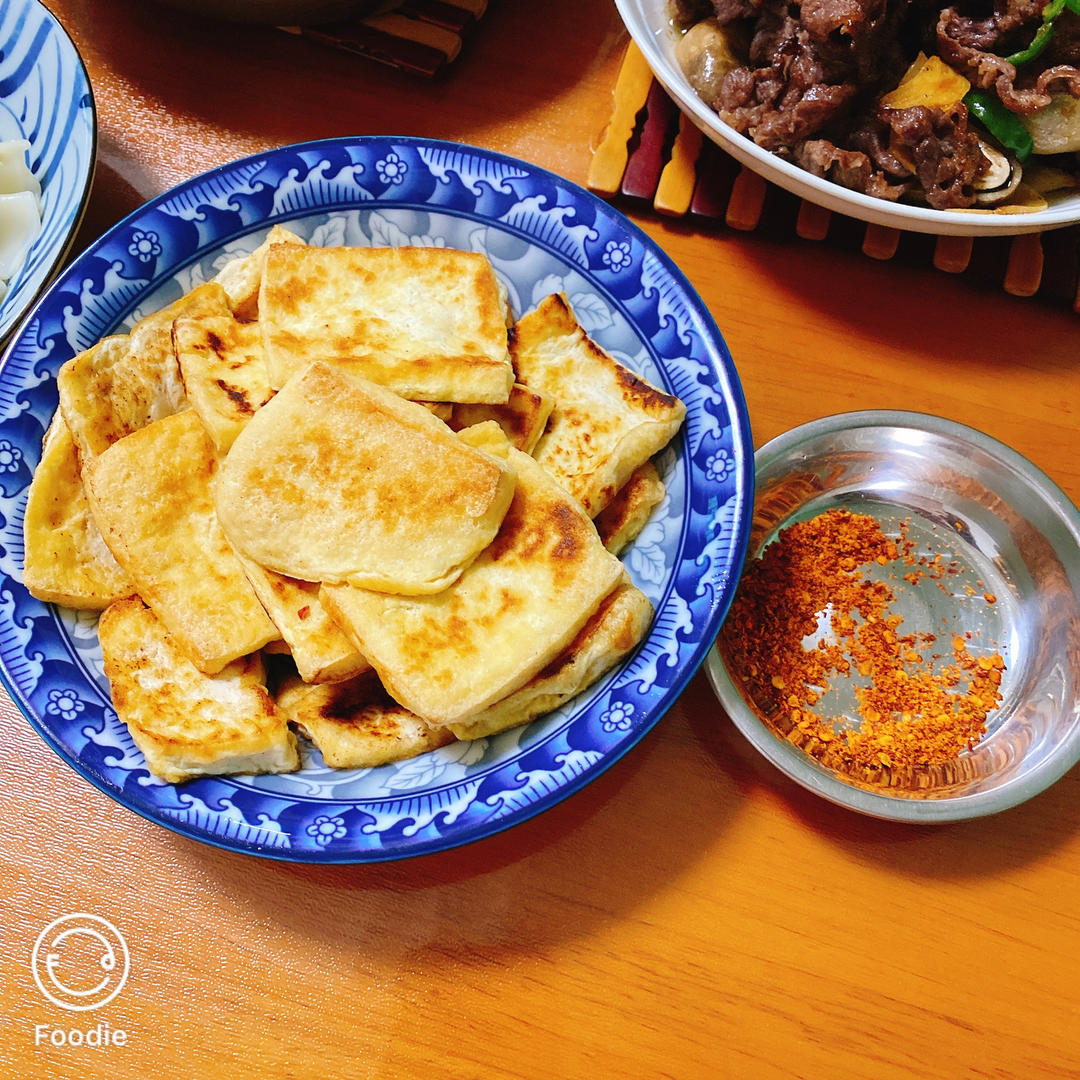 开饭啦!午餐都是家常菜,特别推荐这个煎豆腐的吃法,卤水豆腐煎至金黄色即可,吃的时候直接蘸...