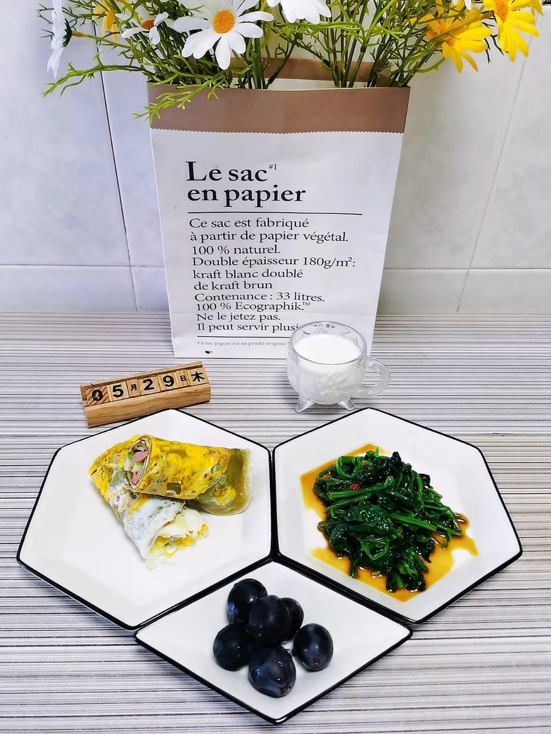 早餐日记92:全麦蔬菜卷饼/酸辣菠菜/牛奶/葡萄