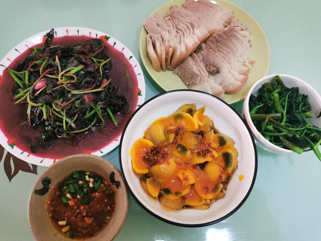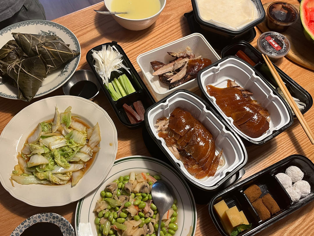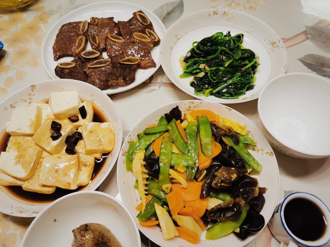 准备美美哒晚餐犒劳辛苦加班的老公,黑椒牛仔骨、荷兰豆炒春笋木耳胡萝卜、清炒菠菜、炝豆腐,豆沙粽子,端午安康哟♥️#晚餐•...