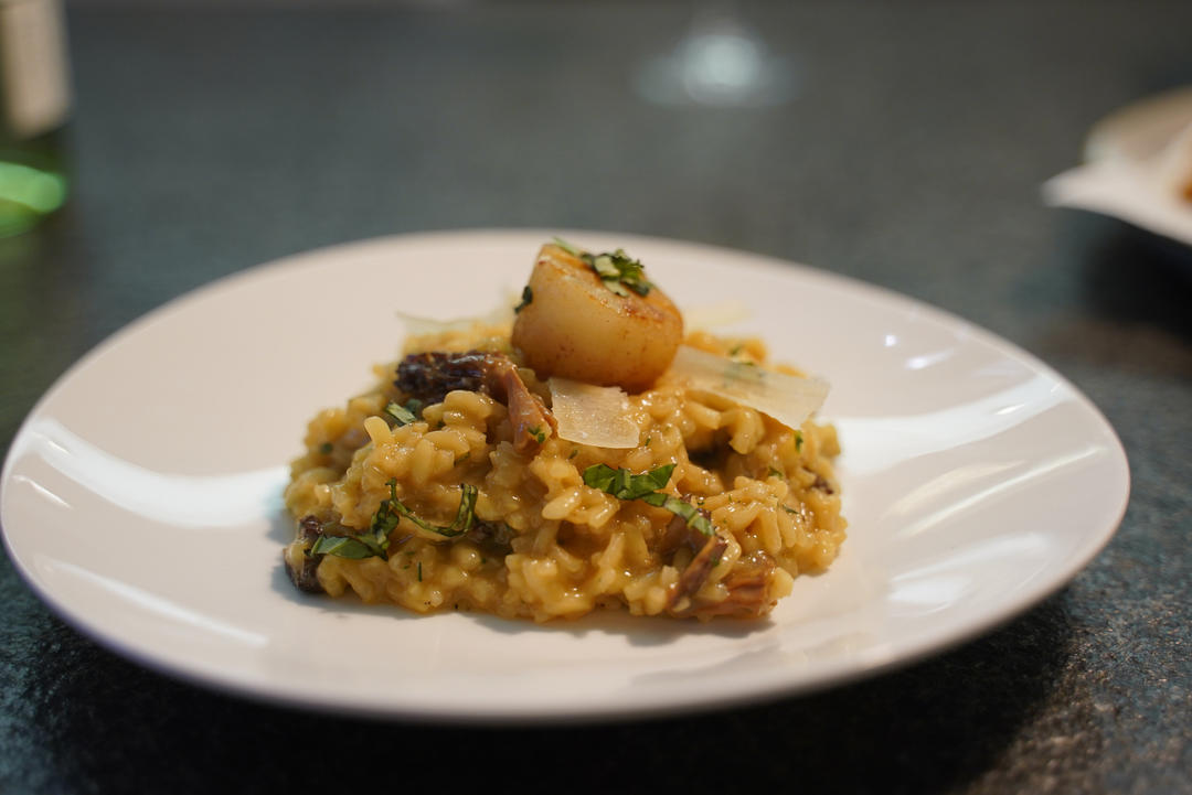 Morels Risotto top with pan-seared scallops
