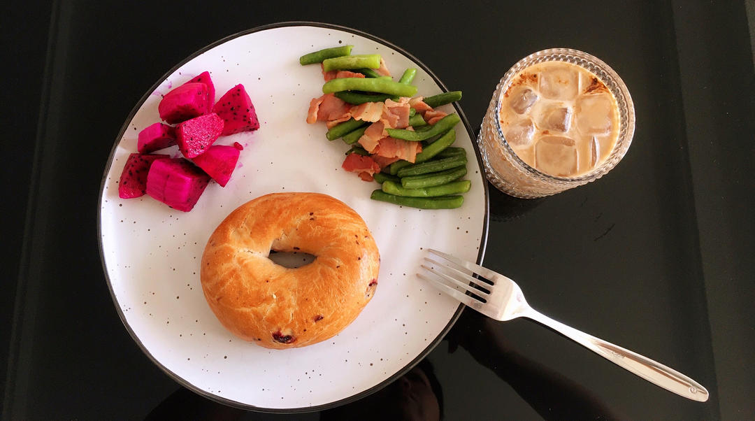 贝果,火龙果,四季豆培根,冰拿铁。