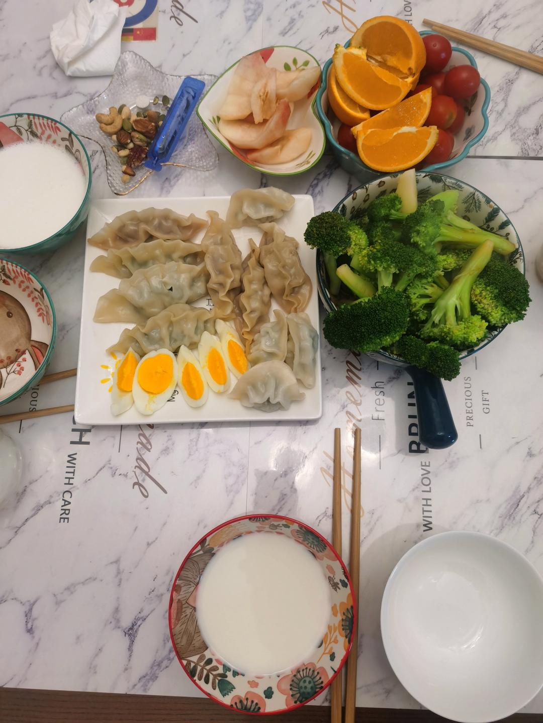 蒸饺,煮鸡蛋,西兰花,水果坚果牛奶