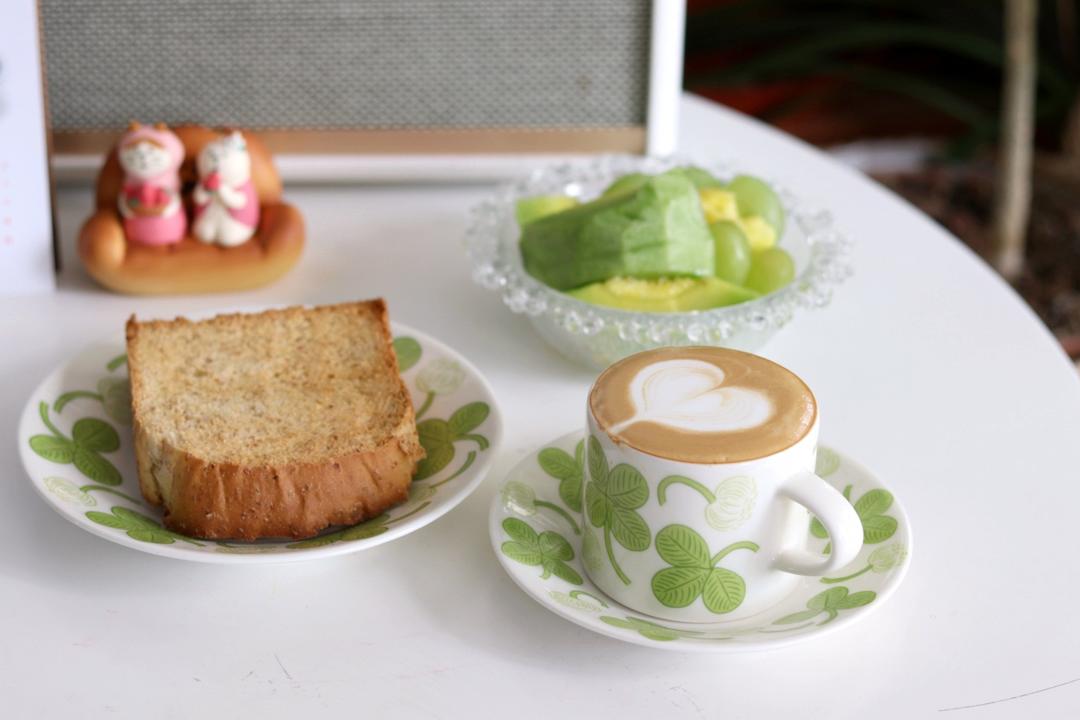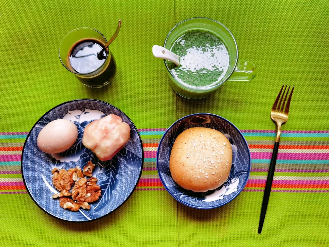 【早餐心语·减脂打卡D44】别弄丢自己,无论环境如何对你。全麦红豆沙馅欧包、鸡蛋、核桃、羽衣甘蓝奇亚籽木瓜奶、黑咖啡、桃...