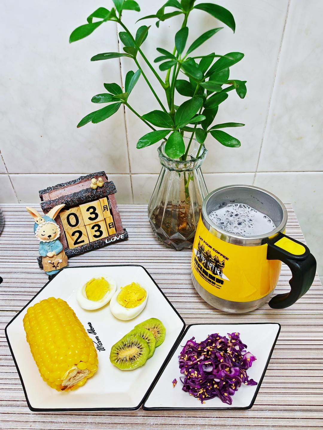 3.23早餐日记:蒸玉米+水煮蛋+拌紫甘蓝+猕猴桃+豆浆
